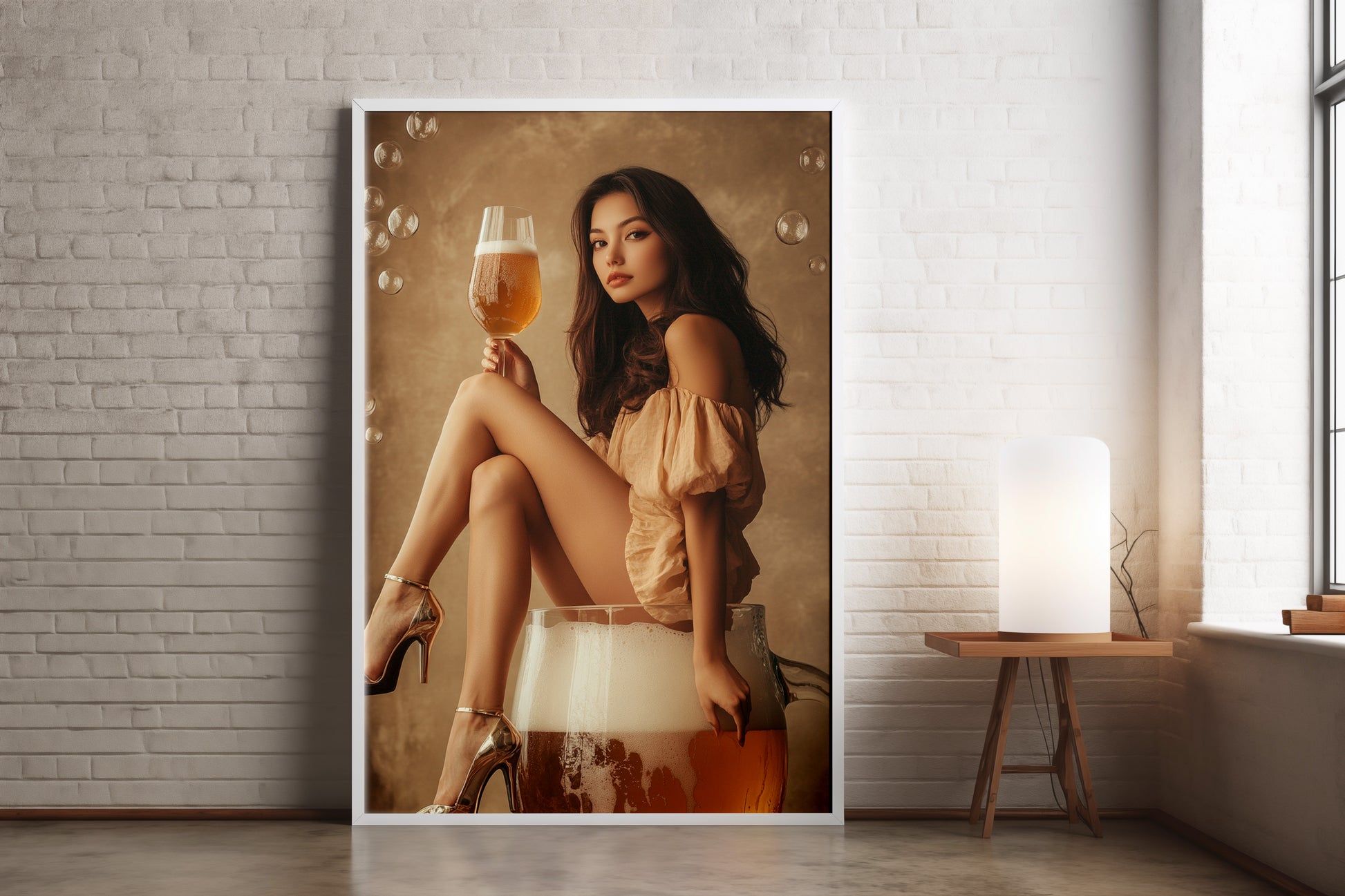 Beer Girl Poster: Playful and eye-catching digital artwork featuring a glamorous woman perched inside a frothy beer mug, holding a matching glass with effortless elegance. The warm brown tones and soft lighting give it a trendy, editorial vibe—perfect for spicing up a dorm room, bar cart corner, or apartment wall. It’s not just wall art; it’s a high-resolution digital download that instantly upgrades any space.