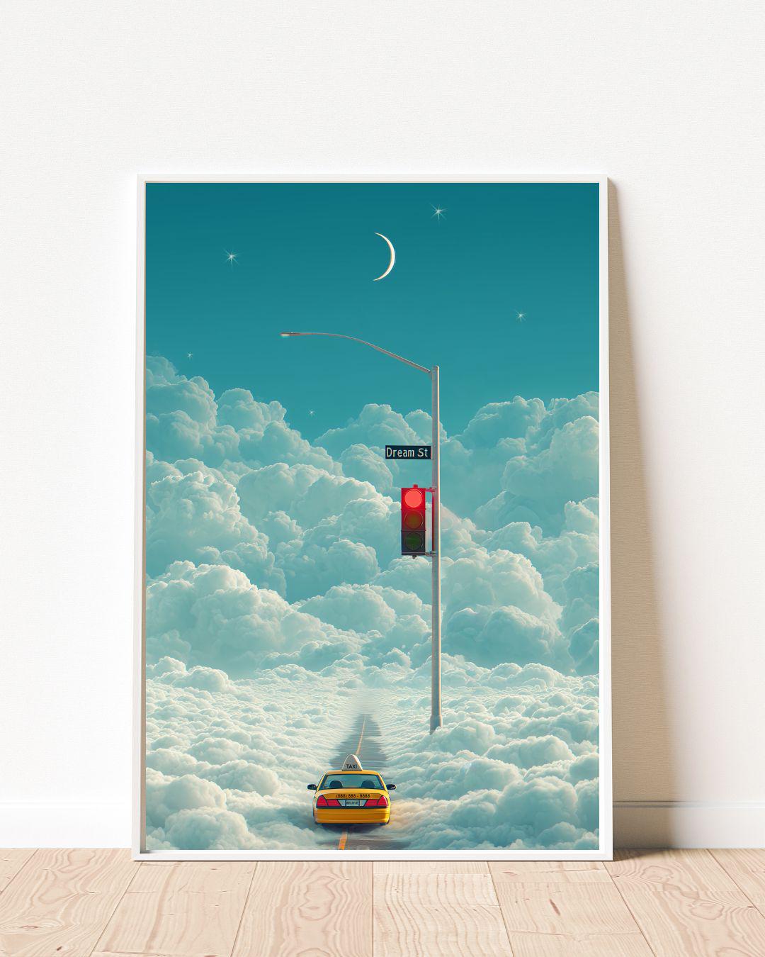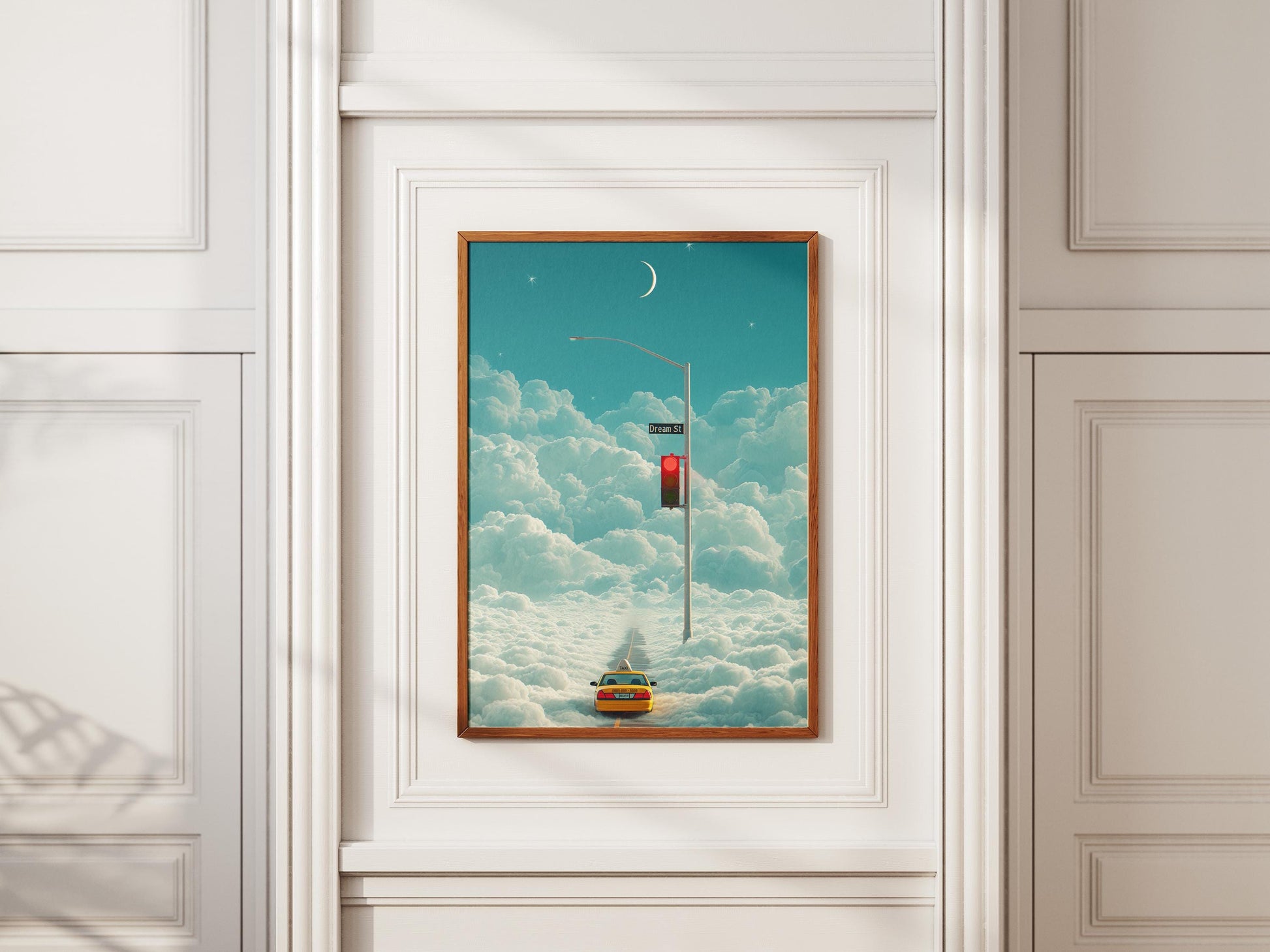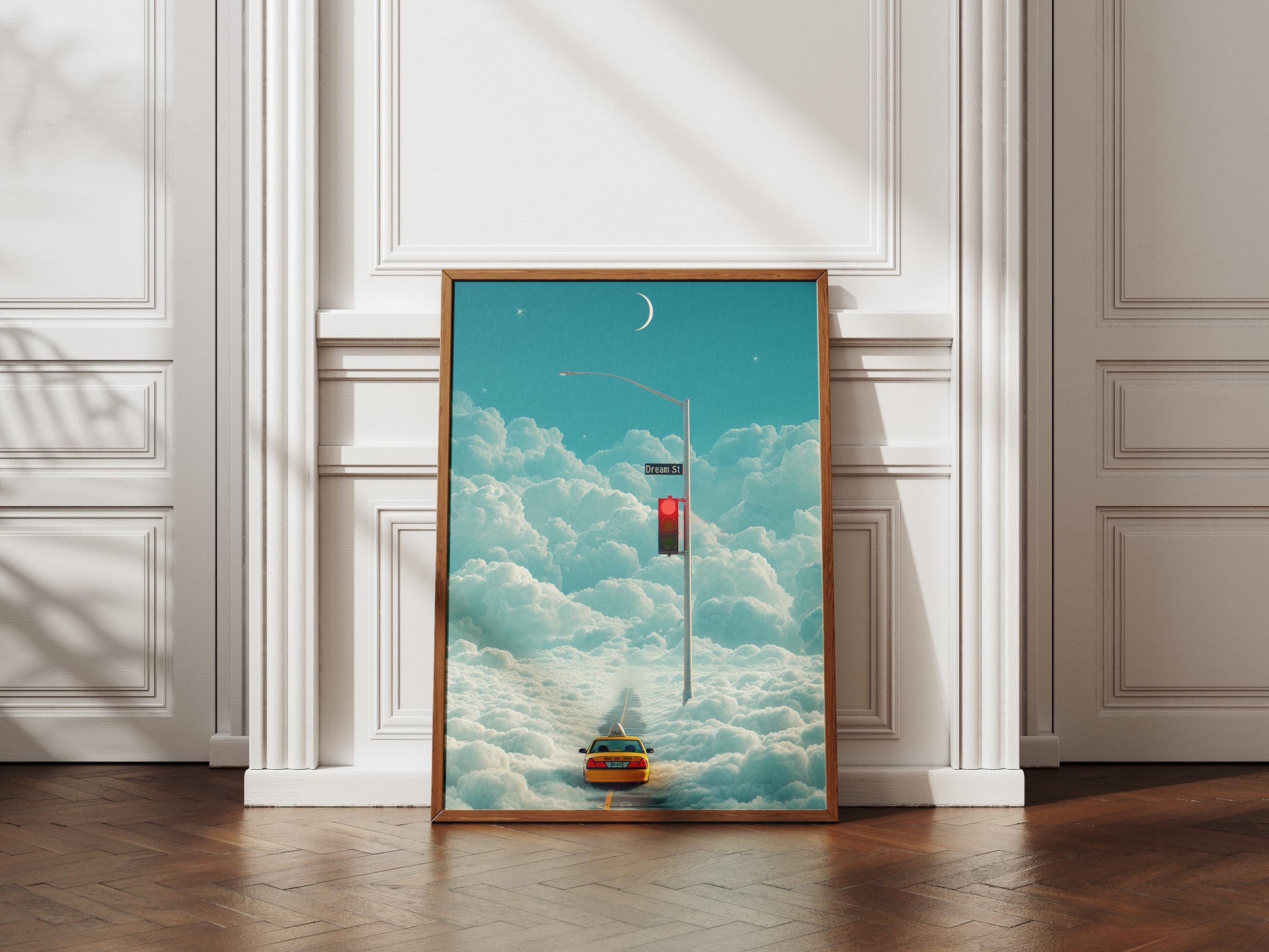 Dream St. Poster: This surreal poster print of a dreamy sky road, complete with a yellow taxi stopped at a glowing red light under a crescent moon, adds a bold sense of wonder and escape to any space. The street sign reads "Dream St." & the license plate reads "Believe", inviting you to pause and drift into your imagination. Perfect for dorm rooms, bedrooms, creative studios, or anywhere that could use a touch of dreamy dopamine decor. This aesthetic wall art download blends retro-futurism with fantasy and is available instantly for easy printing.