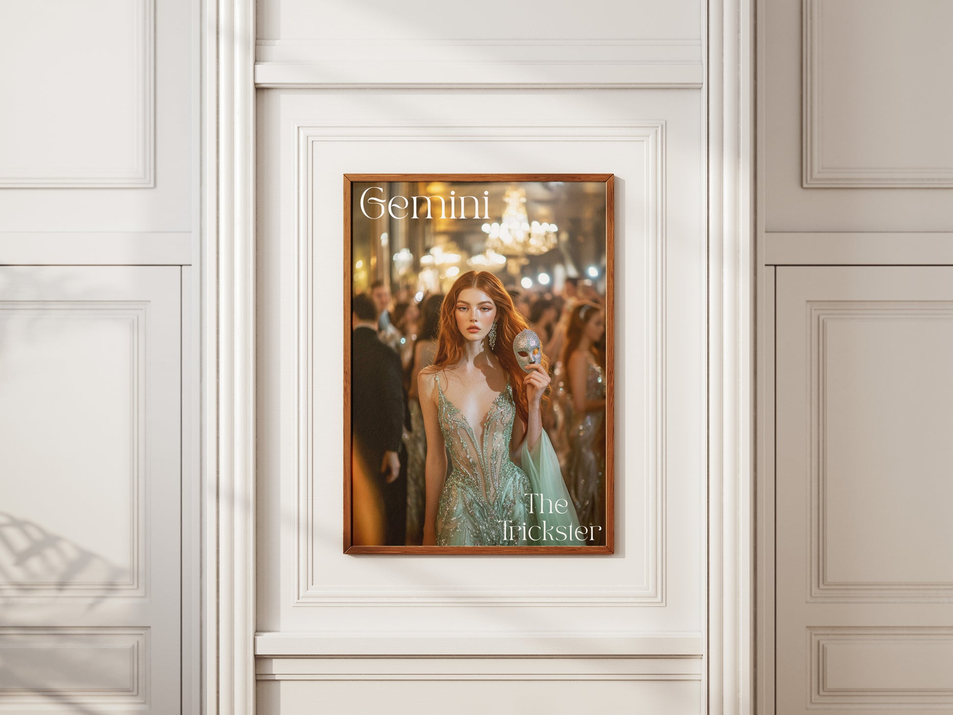 Gemini Zodiac Poster: Luxury zodiac artwork featuring a glamorous woman with a glittering mask, capturing the duality and charm of the Gemini star sign. Whether you’re decorating your own walls or looking for the perfect astrology-inspired gift, this digital print brings sparkle and intrigue to any space. It’s not just art; it’s your invitation to join the ever-curious world of Gemini and the culture of zodiac collectors.