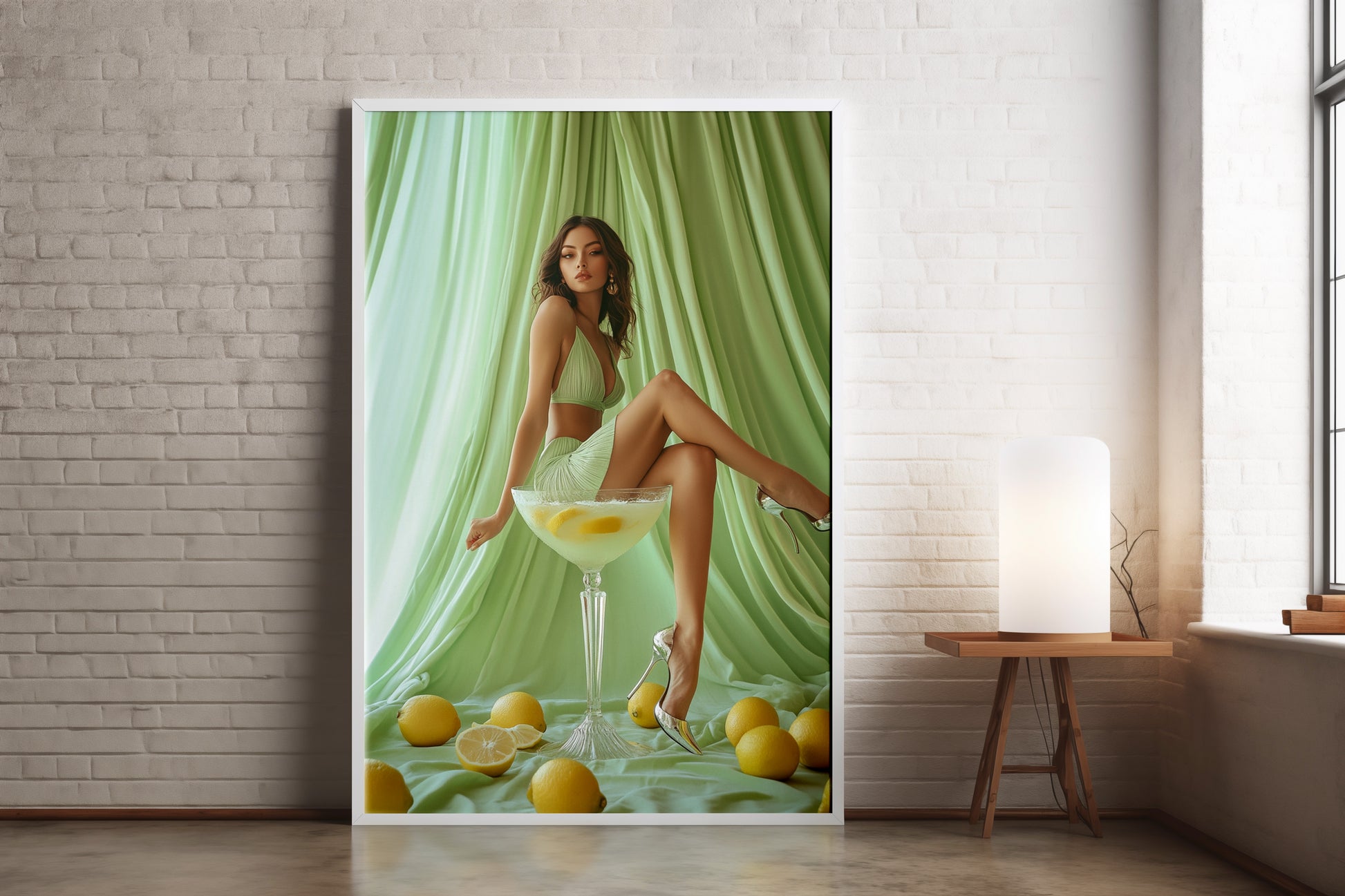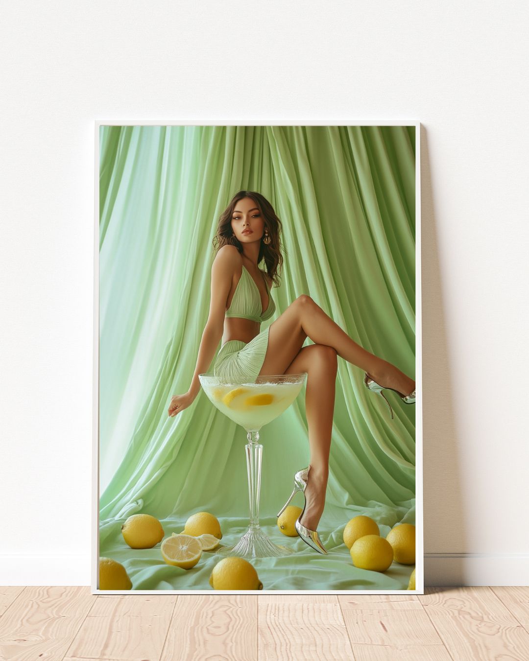 Gin Fizz Cocktail Girl Poster: Elegant and playful digital artwork featuring a confident woman sitting in an oversized cocktail glass, surrounded by lemons and draped in mint green. With a fresh, citrusy vibe and fashion-forward energy, this piece feels like a magazine cover brought to life. Perfect for adding a splash of color to your dorm, bar cart corner, or gallery wall. Itβs not just wall art; itβs a high-resolution digital download designed to turn heads and brighten your space.