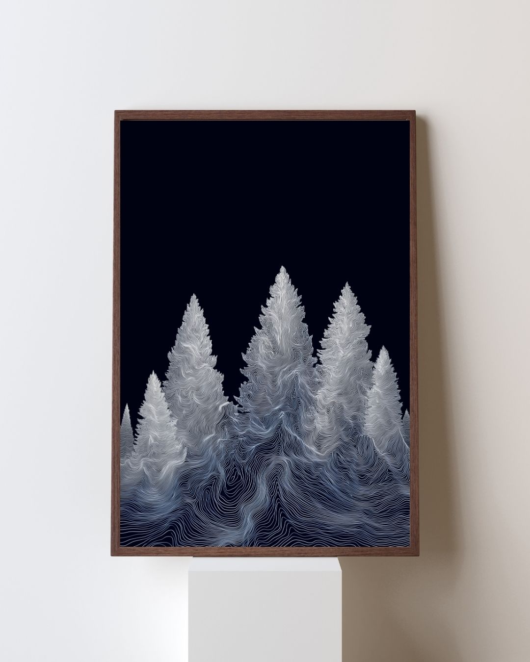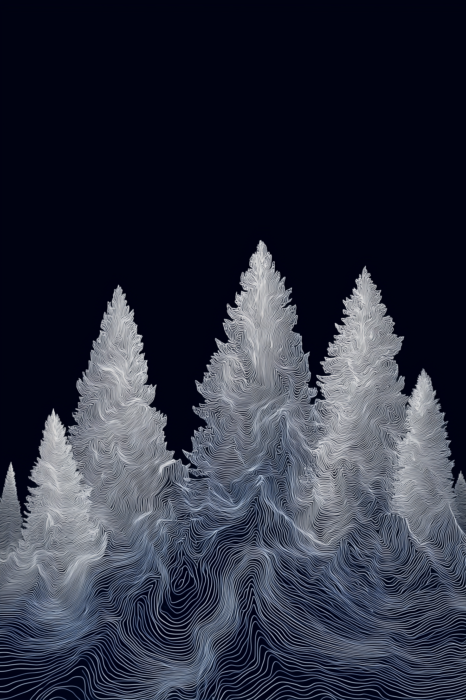 Monochrome Tree Line Poster: A serene forest of fine-lined trees rises against a deep black sky — minimalist, elegant, and impossibly detailed. Each line flows like topographic contours, creating a dreamy silhouette of pine trees that feels both still and alive. This print blends minimalist design with nature’s landscape, drawing inspiration from topographic maps and monochrome aesthetics. A beautiful gift for nature lovers, modern art collectors, or anyone who finds peace in quiet forests and clean lines.