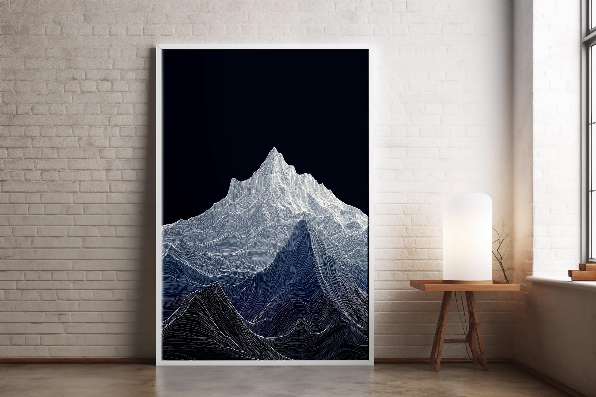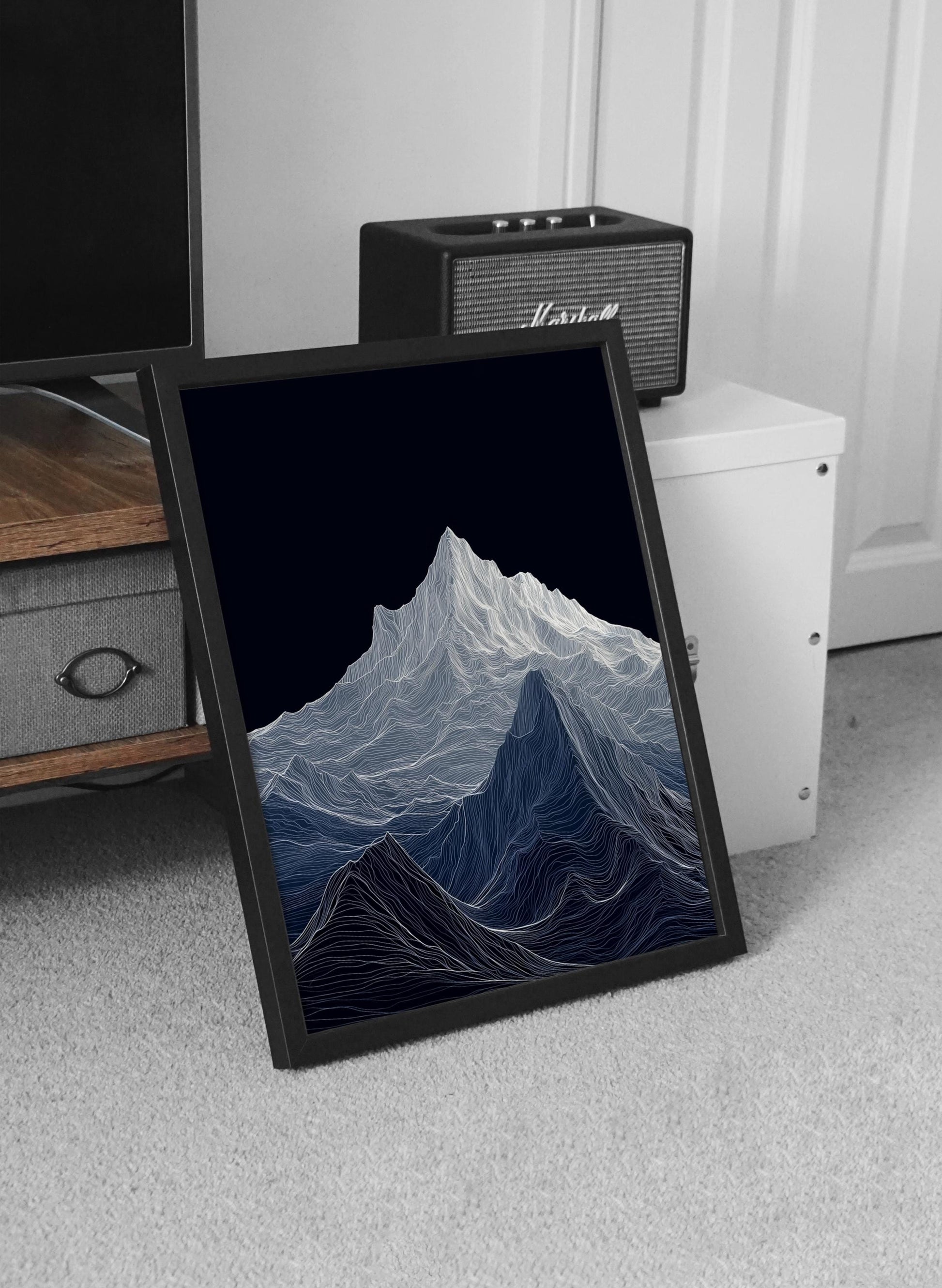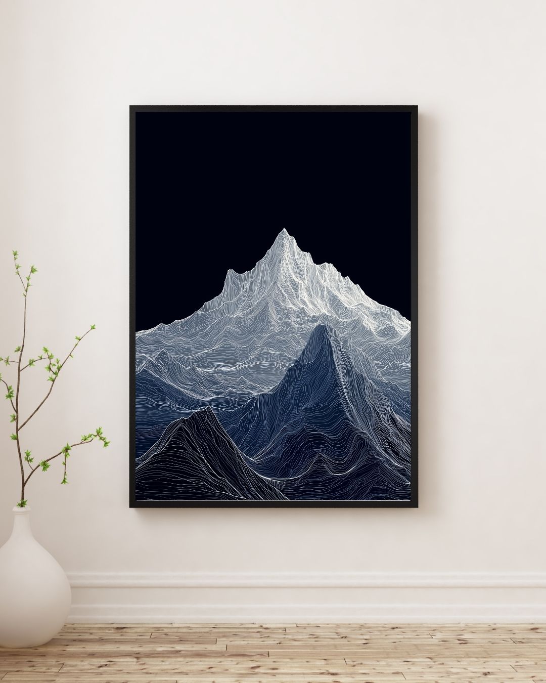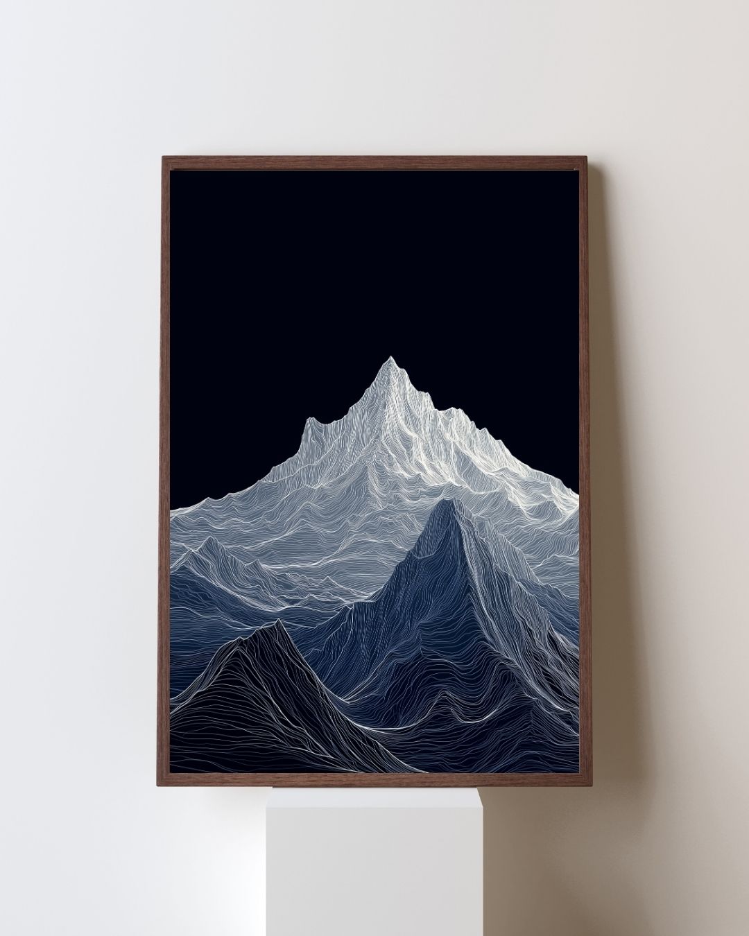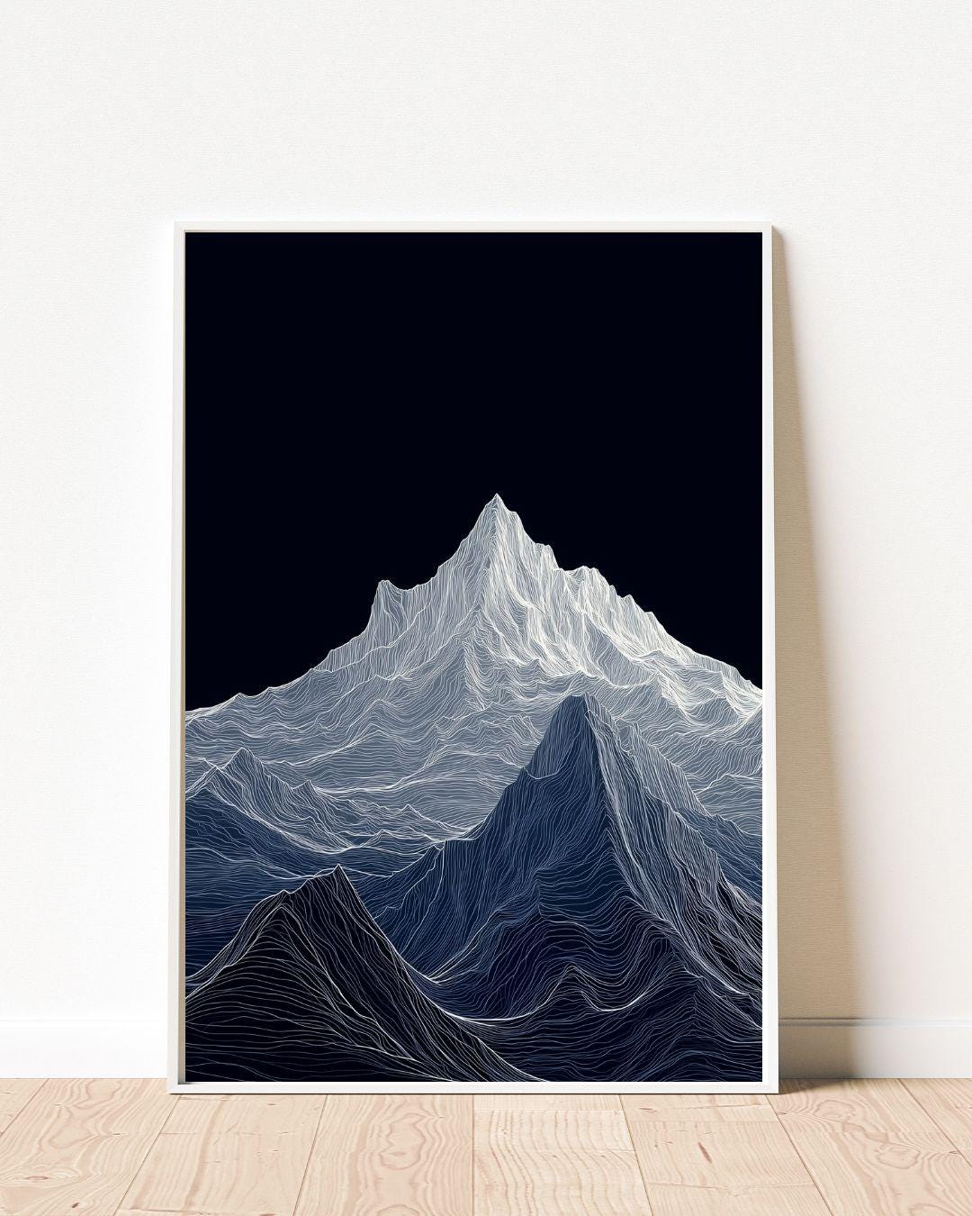 Mountain Topographic Line Poster: A towering mountain range rendered in flowing white topographic lines against a deep midnight sky. This minimalist yet mesmerizing piece draws you in with its texture and movement — the kind of wall art that makes you pause, reflect, and feel small in the best way. This print channels nature through an abstract, modern lens — a blend of digital minimalism and organic elevation. A brilliant gift for hikers, mountain lovers, adventurers, or anyone with a love for bold yet calming decor.