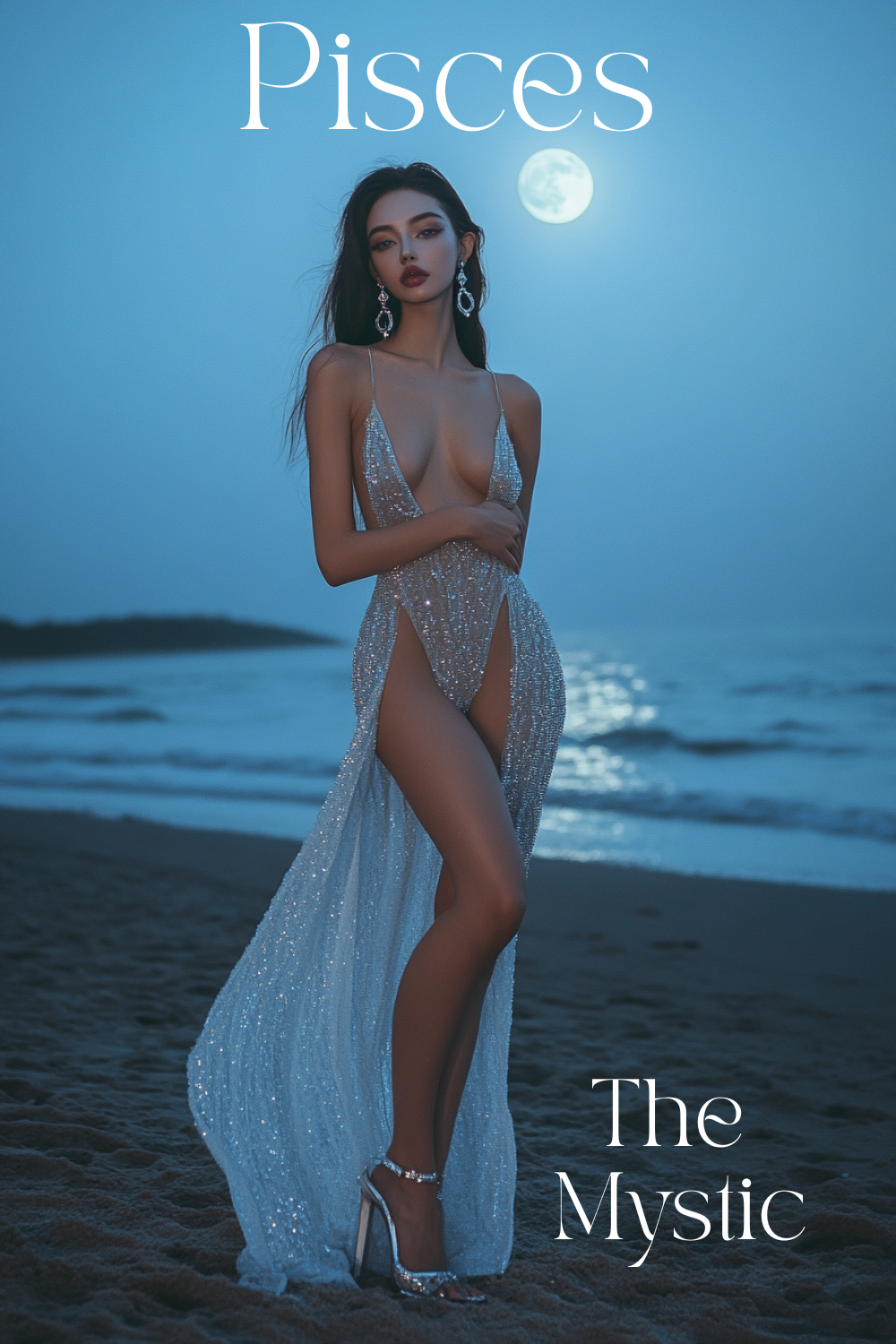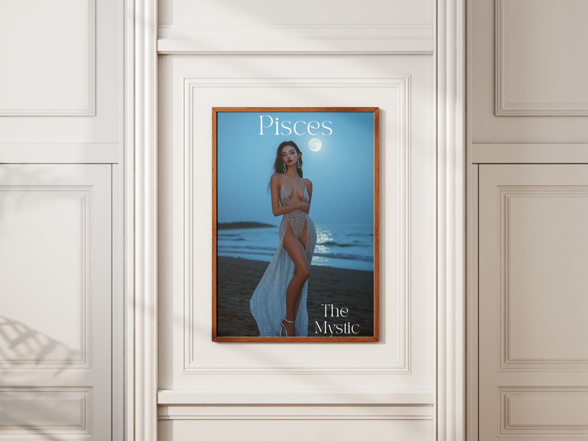 Pisces Zodiac Sign Poster: A digital wall art print featuring a woman standing on the beach at night in a sparkling dress, with the full moon glowing in the sky. Perfect for Pisces birthdays or anyone who connects with the intuitive and dreamy nature of this zodiac sign. Whether youβre decorating your bedroom, office, or gifting a friend, this stylish poster adds a bold astrological touch to your space. Your purchase includes high-resolution files ready to print, making it easy and affordable to upgrade your decor instantly.