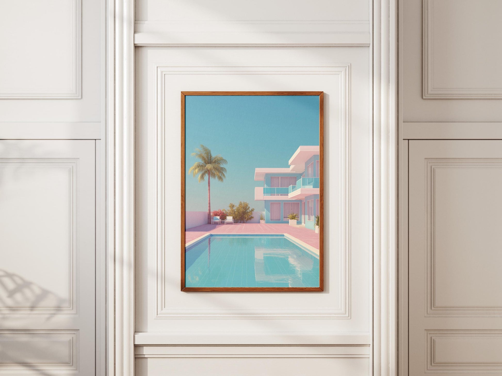 Retro Motel Poster: A sun-drenched motel pool basks under a flawless blue sky, flanked by palm trees and pink tile. The scene feels like a memory—half dream, half postcard from a vacation that never ends. It’s quiet, vibrant, and inviting — the kind of wall art that makes people pause, smile, and look closer. This print captures Hiroshi Nagai’s retro summer aesthetic with dreamcore color palettes — reimagined in a playful, modern context. Perfect for redecorating your own home or a brilliant gift for aesthetes, daydreamers, or anyone with a love of 80s nostalgia and timeless vacation vibes.