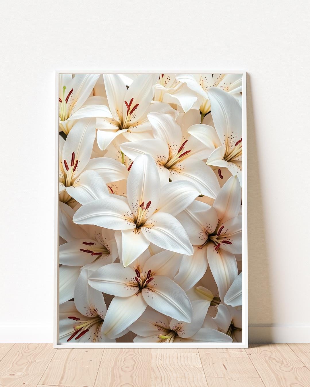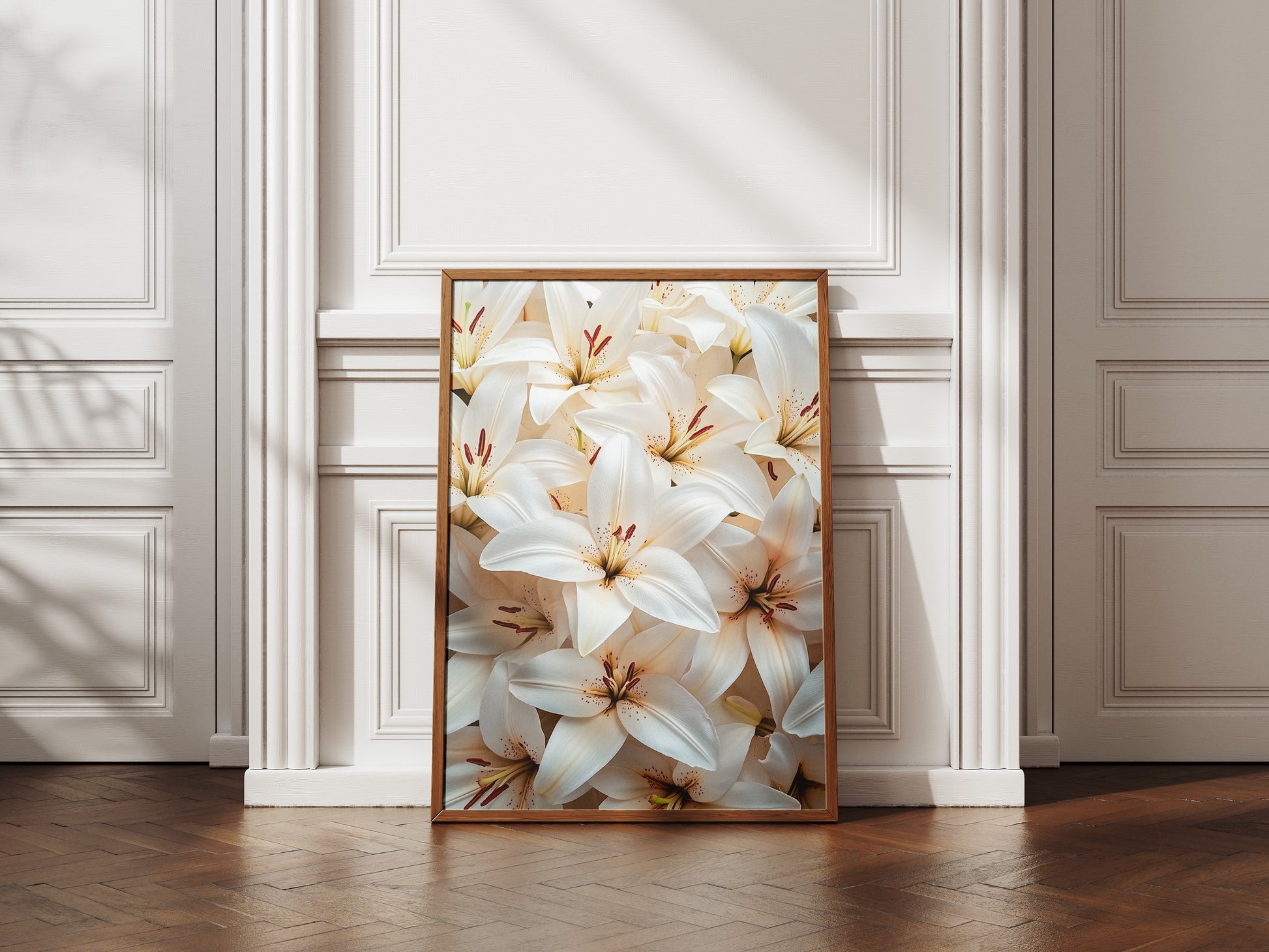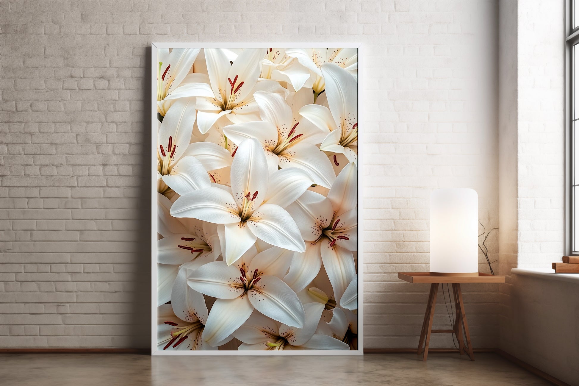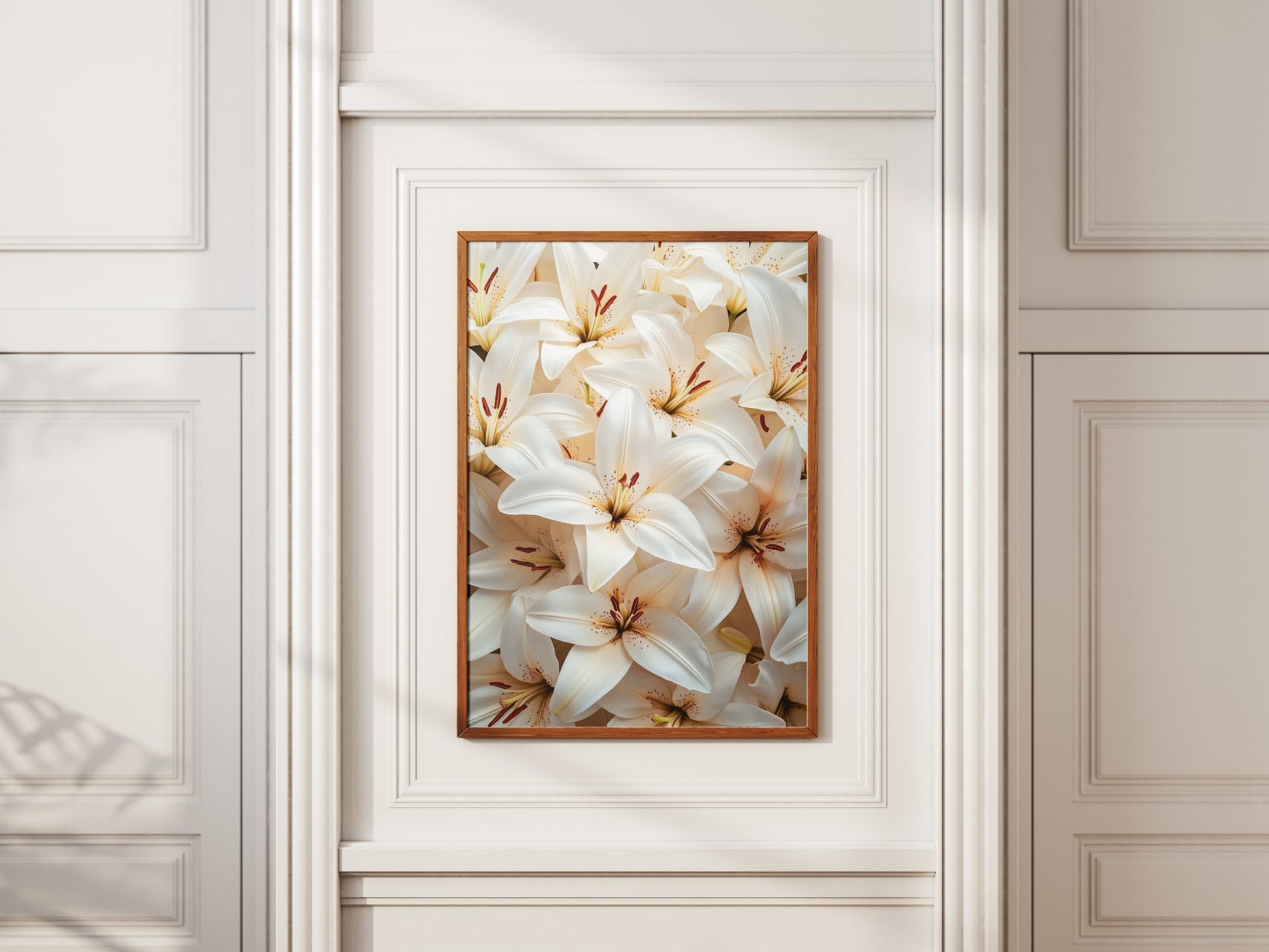White Lily Poster: Elegant floral art featuring a soft cluster of creamy white lilies in full bloom. This high-resolution digital download brings a sense of purity and calm to any space, from bedrooms to living rooms and beyond. Whether you’re refreshing your home decor or looking for the perfect gift for a flower lover, this printable wall art adds timeless beauty and grace to your gallery wall. It’s more than a decoration—it’s a celebration of simplicity, elegance, and nature’s quiet luxury.